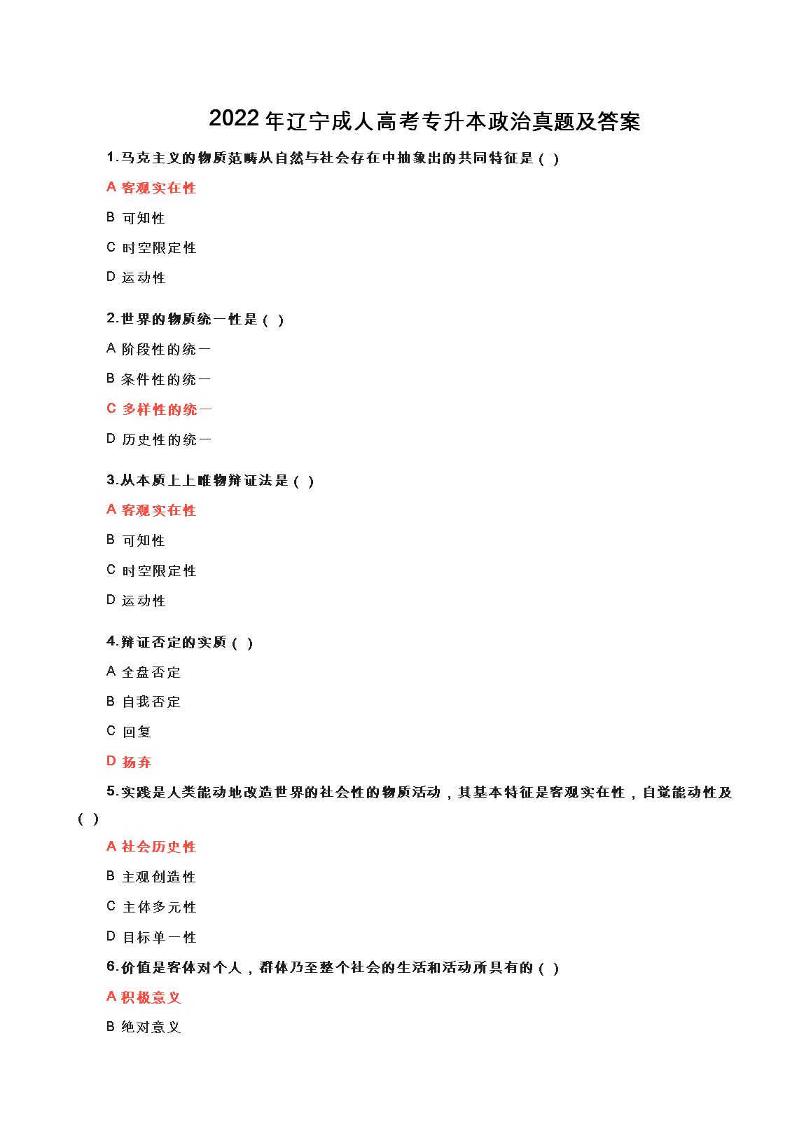 【文档名称】 2022年辽宁成人高考专升本政治真题及答案(Word版).doc