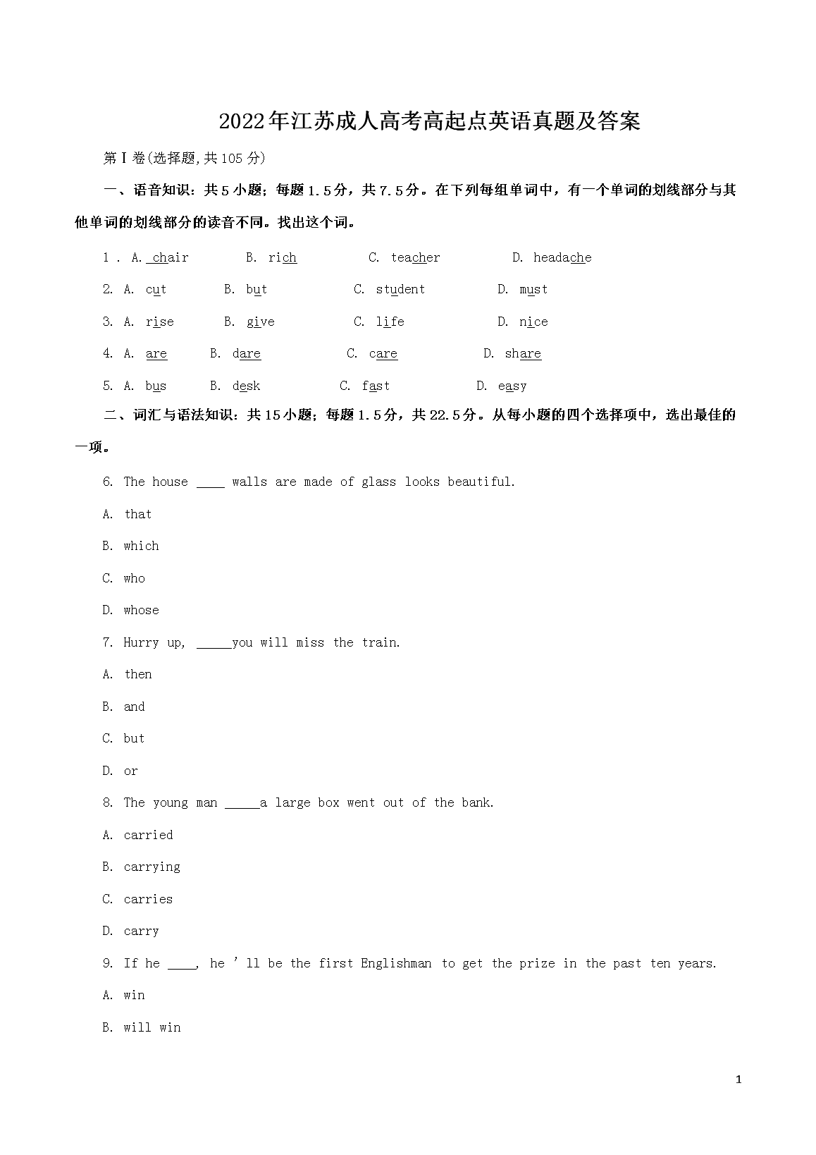 【文档名称】 2022年江苏成人高考高起点英语真题及答案(Word版).doc