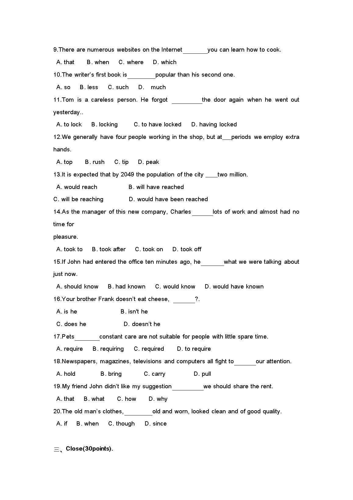 【文档预览】 无忧考网整理发布2022年江苏成人高考专升本英语真题及答案(Word版),前五页预览如下: