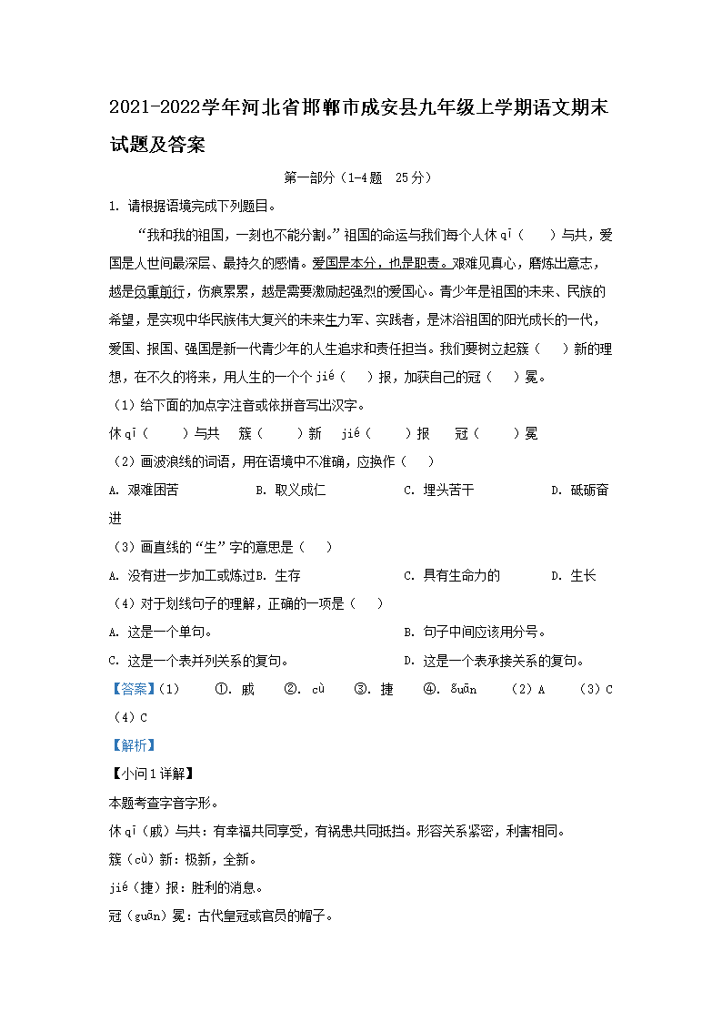 【文档名称】 2021-2022学年河北省邯郸市成安县九年级上学期语文期末试题及答案(Word版).doc