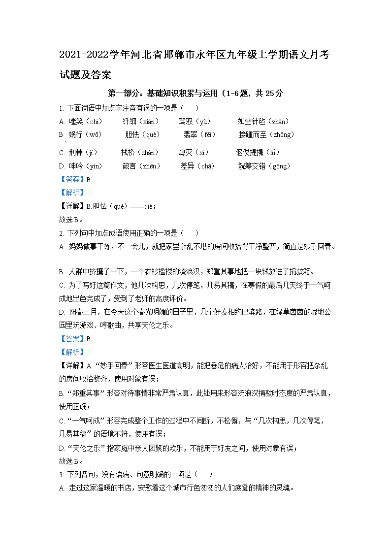 【文档名称】 2021-2022学年河北省邯郸市永年区九年级上学期语文月考试题及答案(Word版).doc