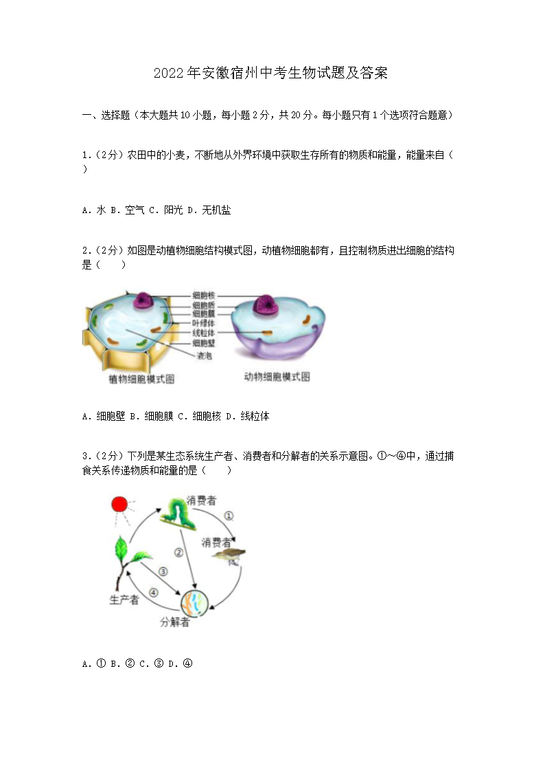 【文档预览】 无忧考网整理发布2022年安徽宿州中考生物试题及答案(Word版),前五页预览如下: