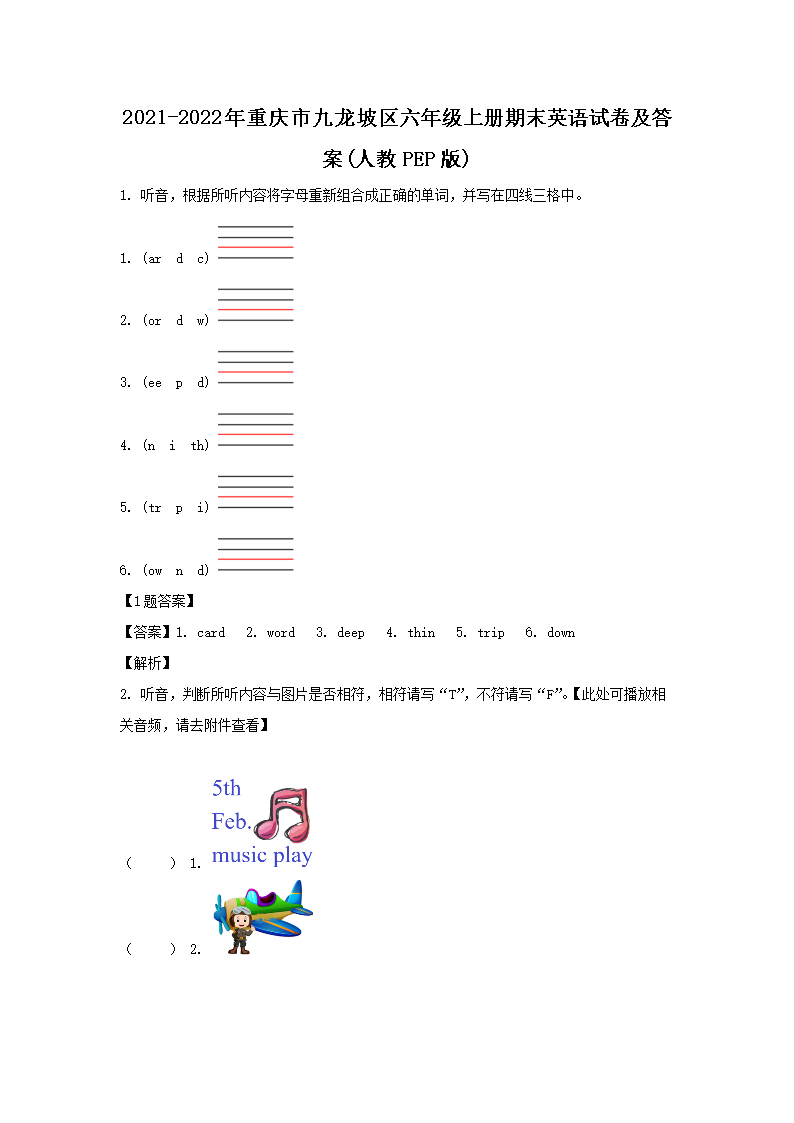 【文档预览】 无忧考网整理发布2021-2022年重庆市九龙坡区六年级上册期末英语试卷及答案(人教PEP版)(Word版),前五页预览如下: