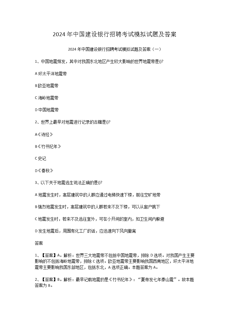 【文档名称】 2024年中国建设银行招聘考试模拟试题及答案(Word版).doc