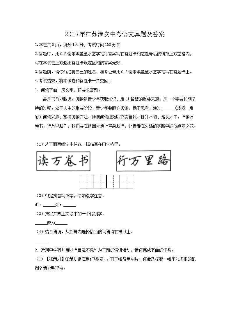 【文档名称】 2023年江苏淮安中考语文真题及答案(Word版).doc