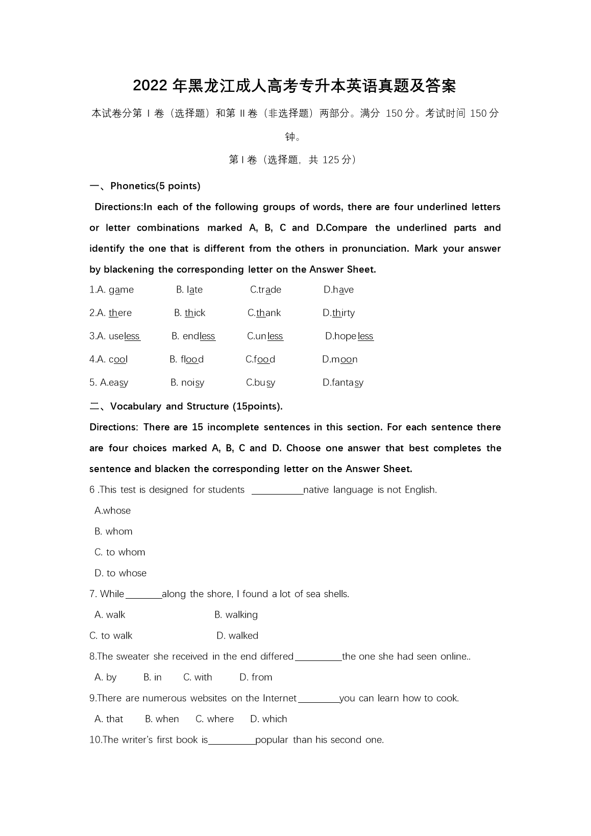 【文档预览】 无忧考网整理发布2022年黑龙江成人高考专升本英语真题及答案(Word版),前五页预览如下: