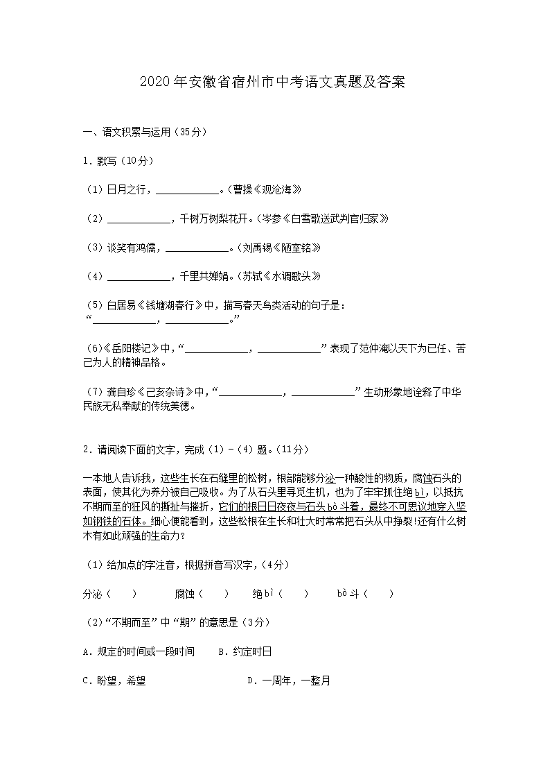 【文档名称】 2020年安徽省宿州市中考语文真题及答案(Word版).doc