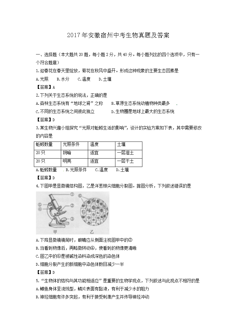 【文档预览】 无忧考网整理发布2017年安徽宿州中考生物真题及答案(Word版),前五页预览如下: