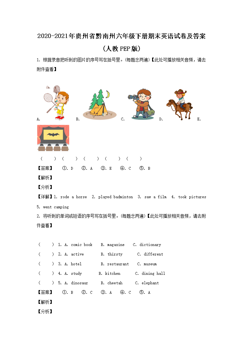 【文档预览】 无忧考网整理发布2020-2021年贵州省黔南州六年级下册期末英语试卷及答案(人教PEP版)(Word版),前五页预览如下: