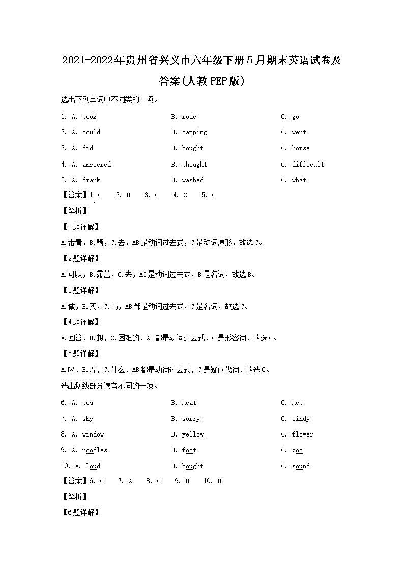 【文档名称】 2021-2022年贵州省兴义市六年级下册5月期末英语试卷及答案(人教PEP版)(Word版).doc