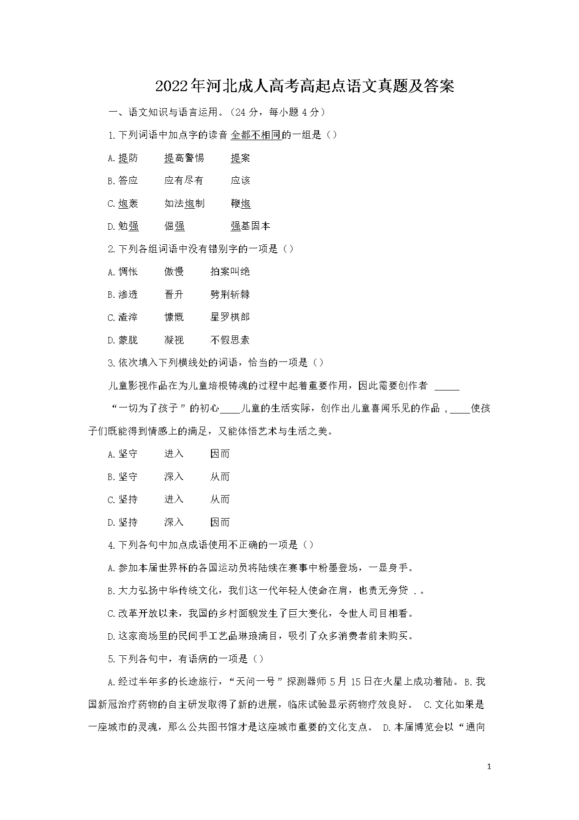 【文档名称】 2022年河北成人高考高起点语文真题及答案(Word版).doc