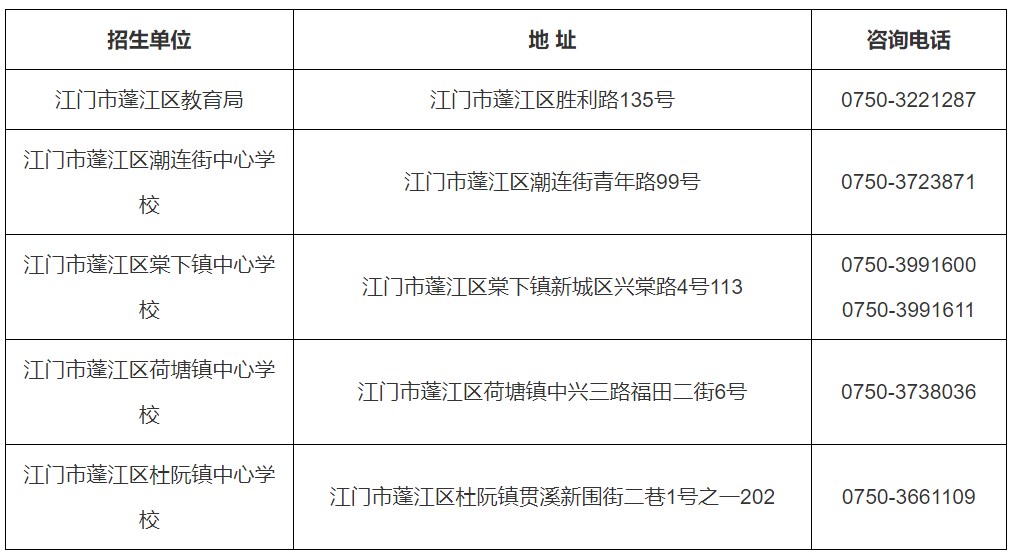 注:棠下镇、荷塘镇、杜阮镇、潮连街户籍的适龄儿童由各镇街安排入学。