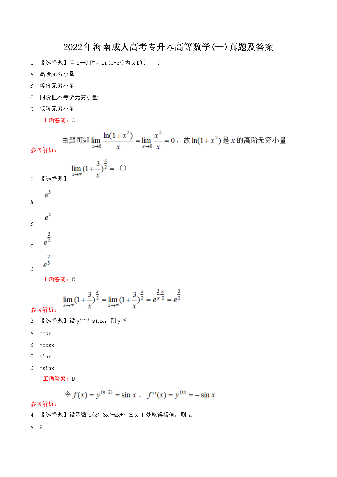 【文档名称】 2022年海南成人高考专升本高等数学(一)真题及答案(Word版).doc