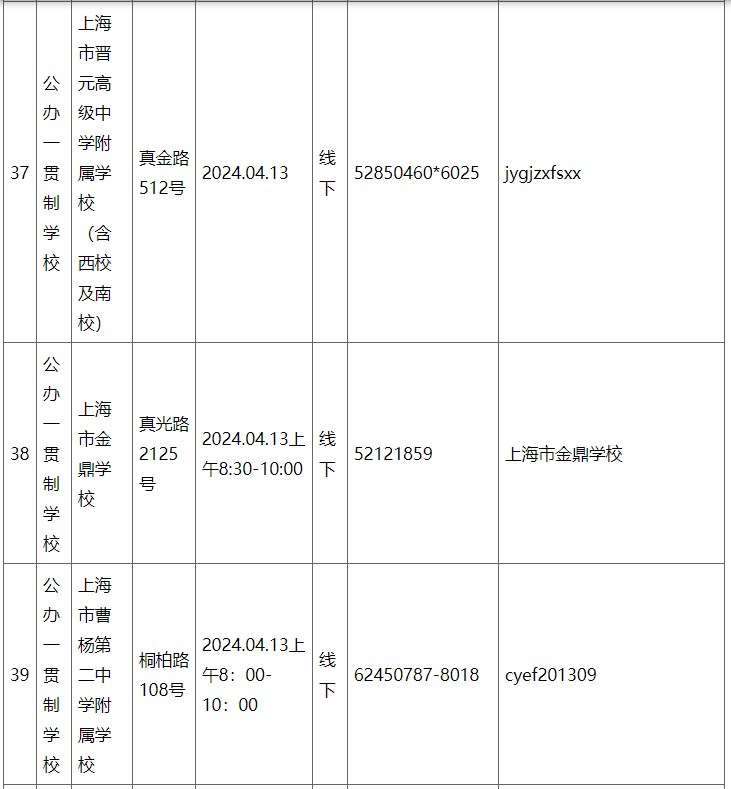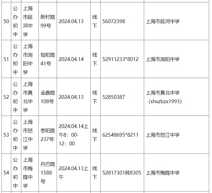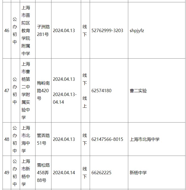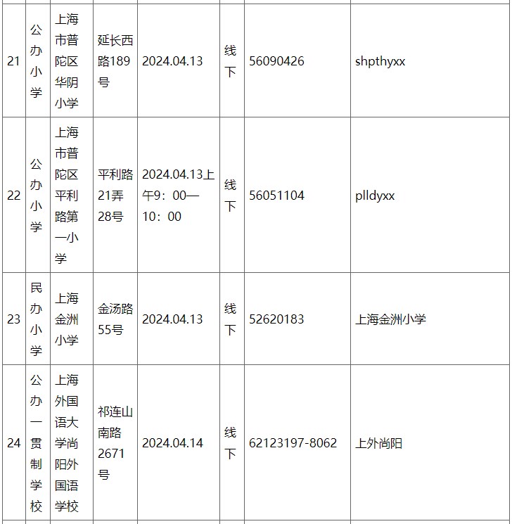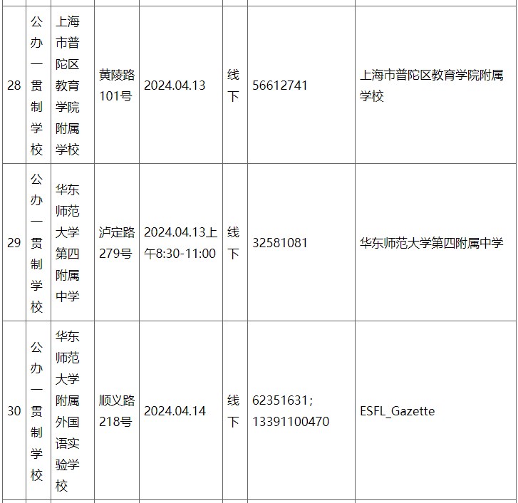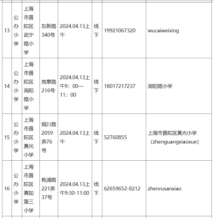 上海普陀区2024义务教育阶段学校校园开放日信息表