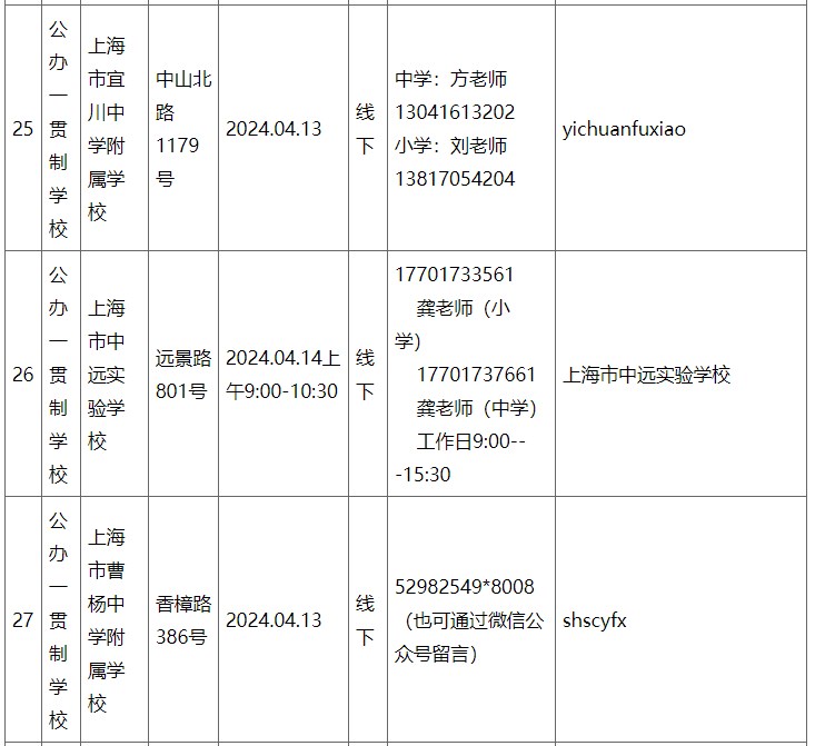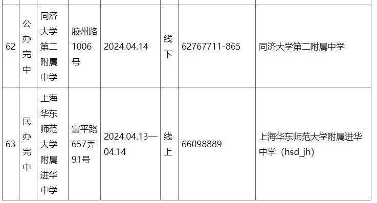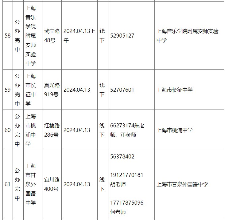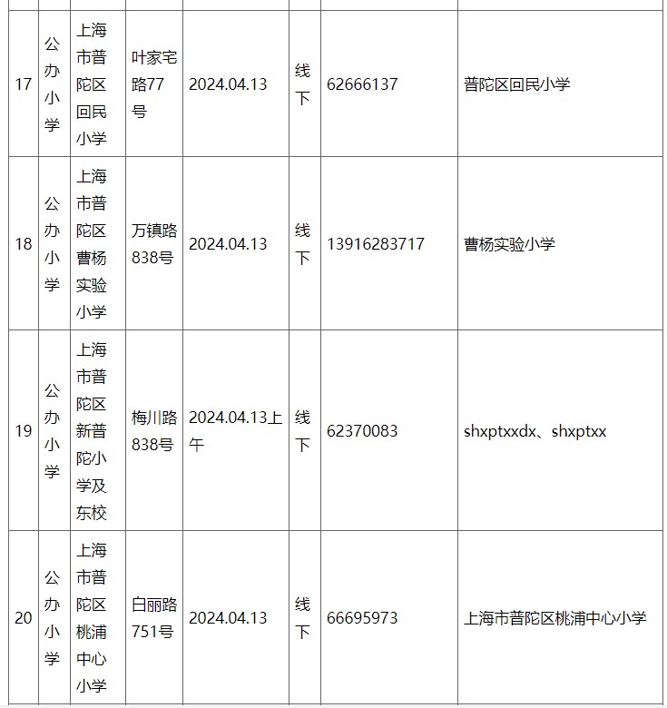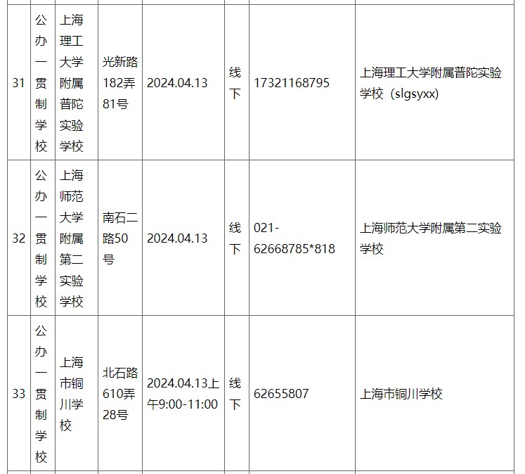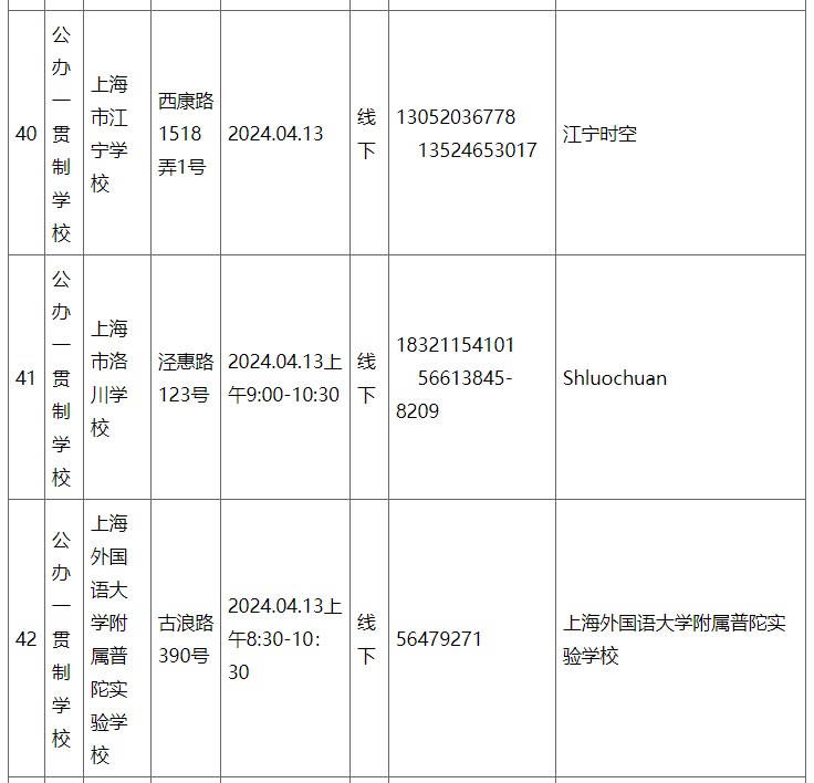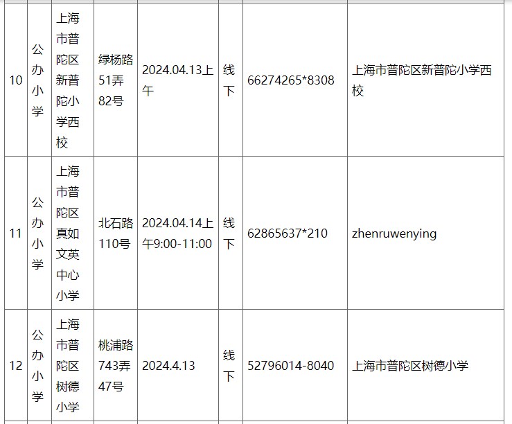 上海普陀区2024义务教育阶段学校校园开放日信息表