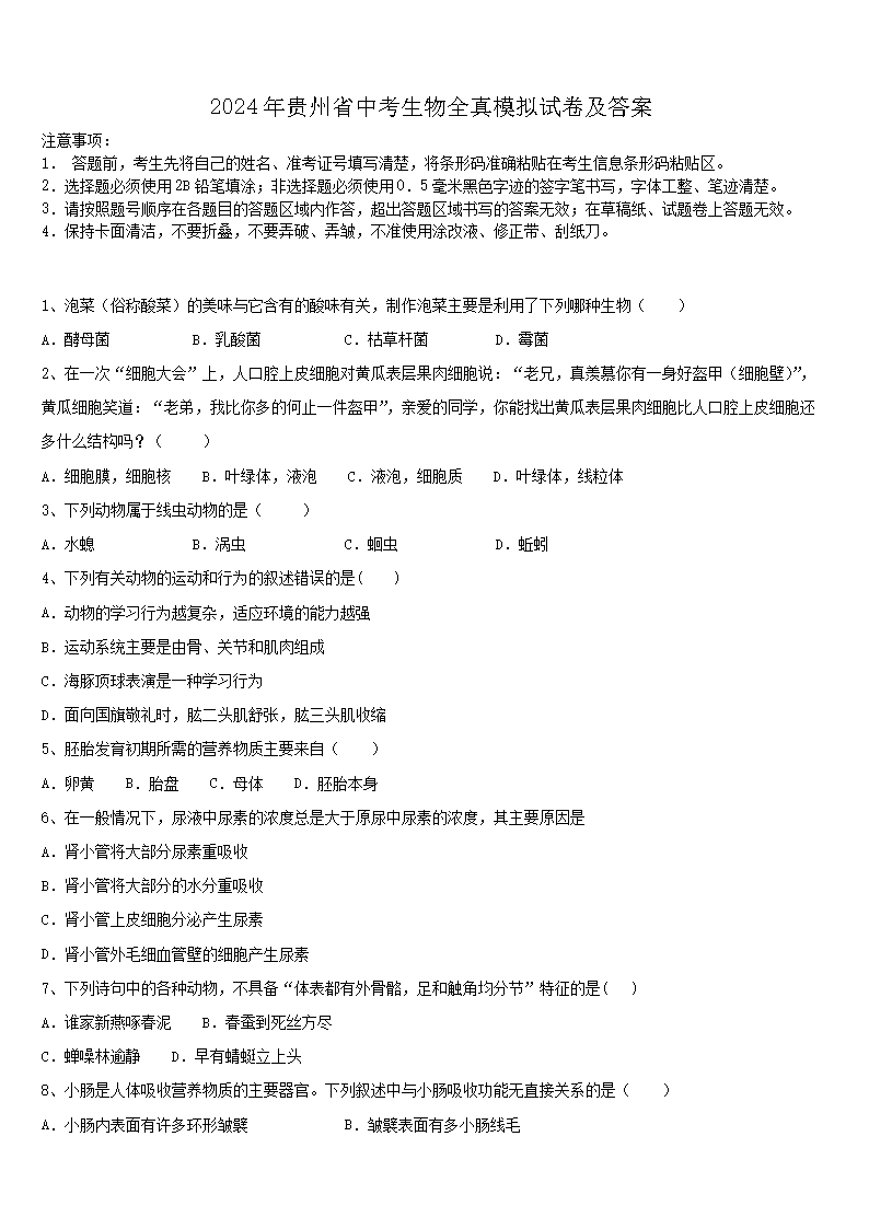 【文档名称】 2024年贵州省中考生物全真模拟试卷及答案(Word版).doc