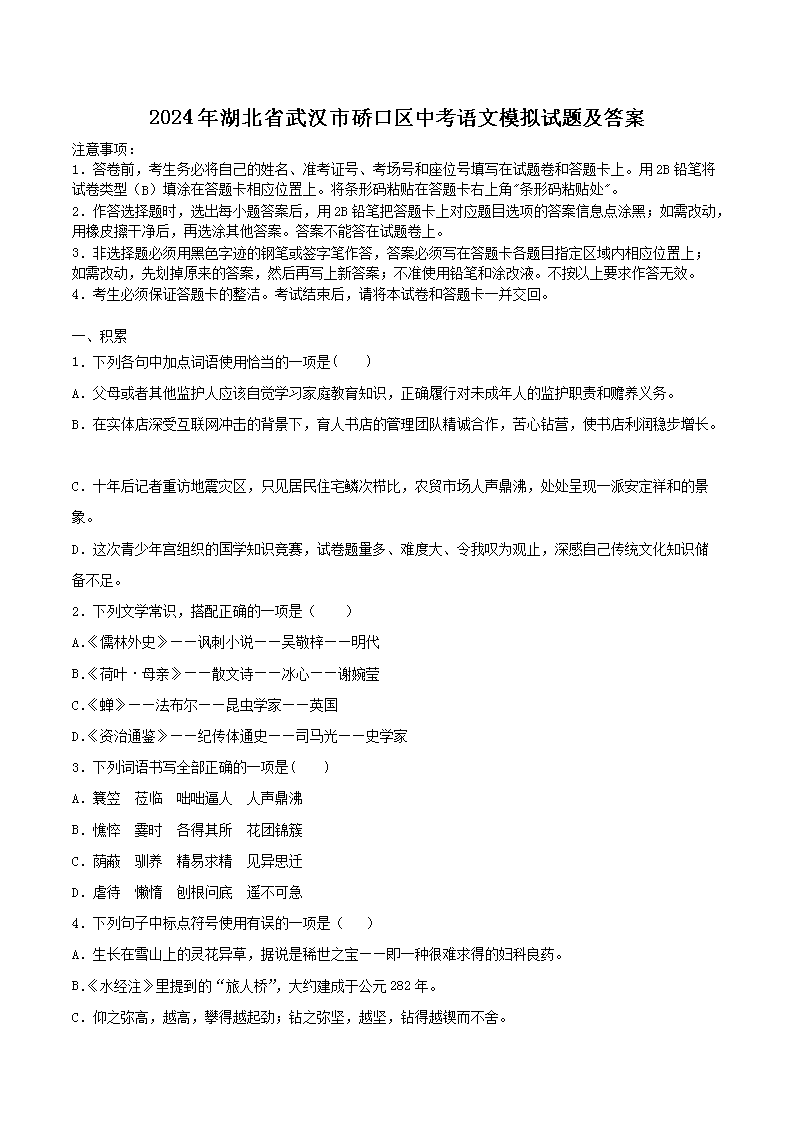 【文档名称】 2024年湖北省武汉市硚口区中考语文模拟试题及答案(Word版).doc