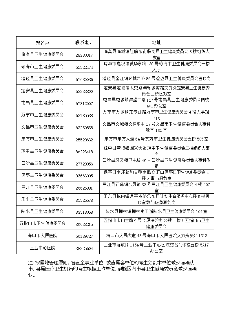 2024年4月24日-5月7日,考生持《高级卫生专业技术资格考试报名表》和相关证件、材料、报名费到所属市县卫生健康委或卫生健康委直属单位的人事部门进行信息确认、资格审核等工作。2024年5月10日前,各报名点将考试报名资料报送至海南省医学学术交流管理中心,逾期不予受理。