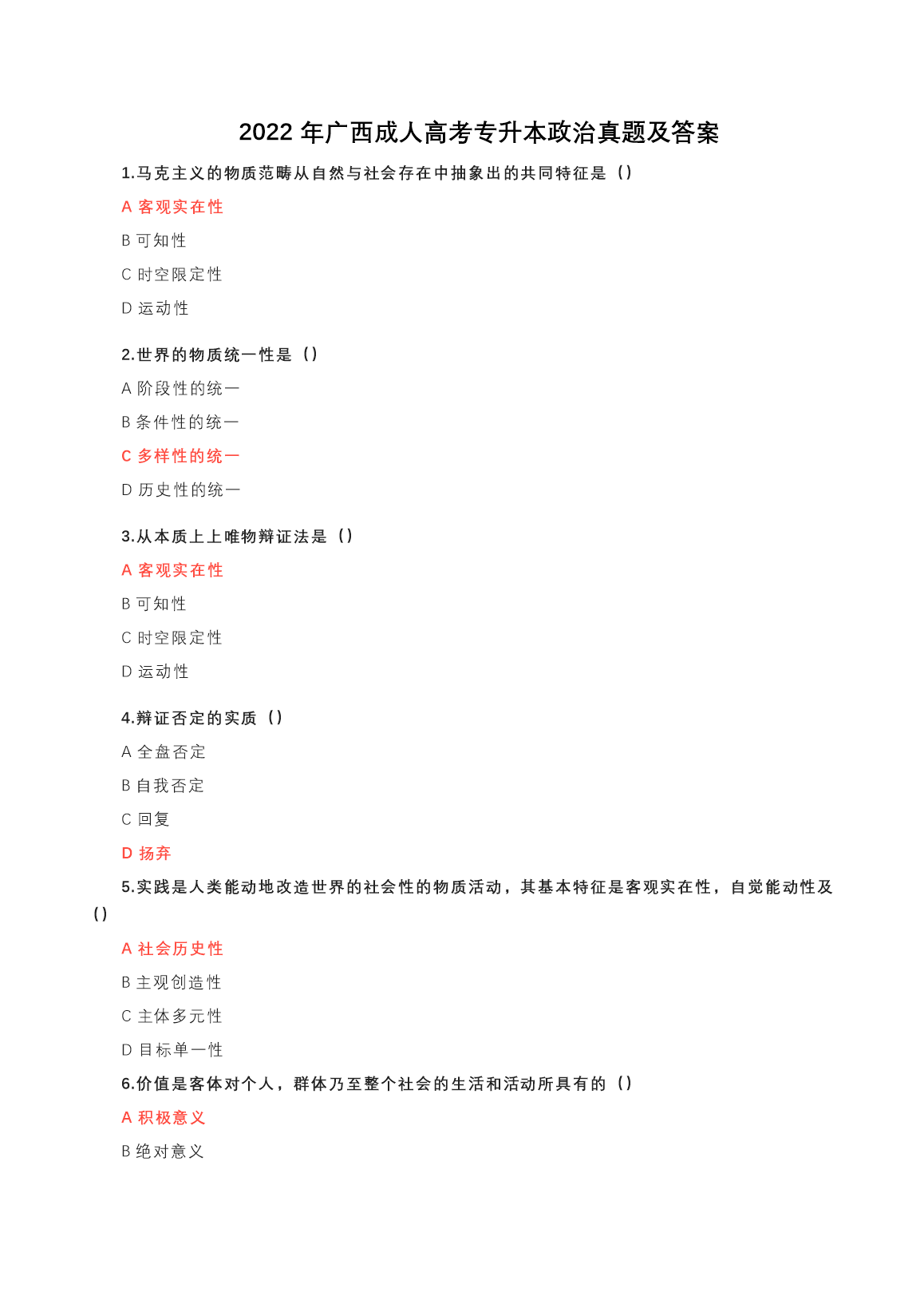 【文档名称】 2022年广西成人高考专升本政治真题及答案(Word版).doc