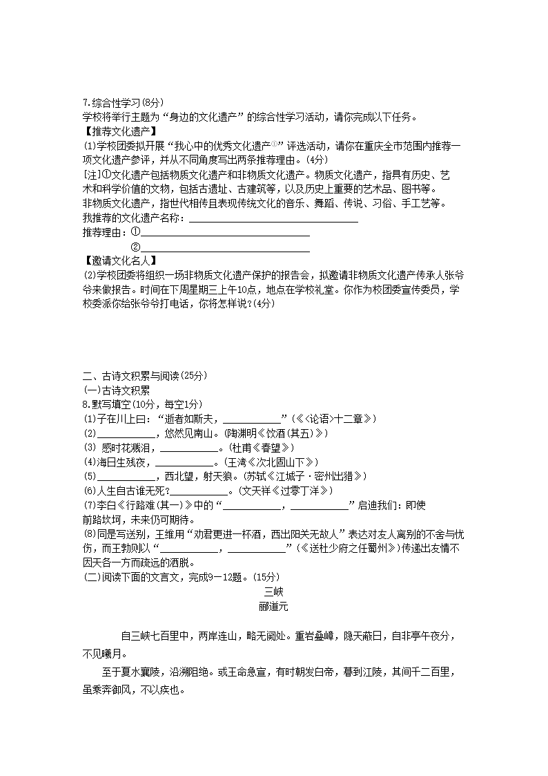 【文档名称】 2020年重庆九龙坡中考语文真题及答案B卷(Word版).doc