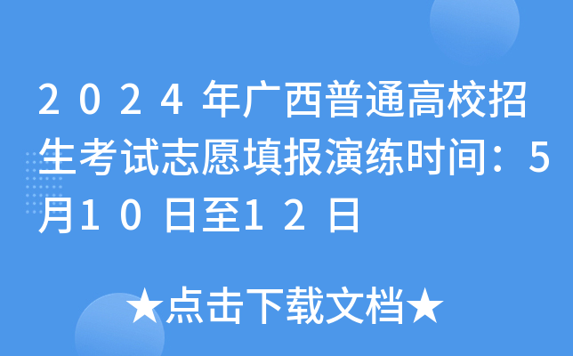 【#高考# #2024年广西普通高校招生考试志愿填报演练时间:5月10日至12日#】©无忧考网从广西招生考试院了解到,2024年广西普通高校招生考试志愿填报演练时间:5月10日至12日,相关事宜详情如下:
