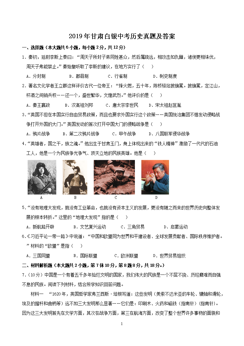 【文档名称】 2019年甘肃白银中考历史真题及答案(Word版).doc