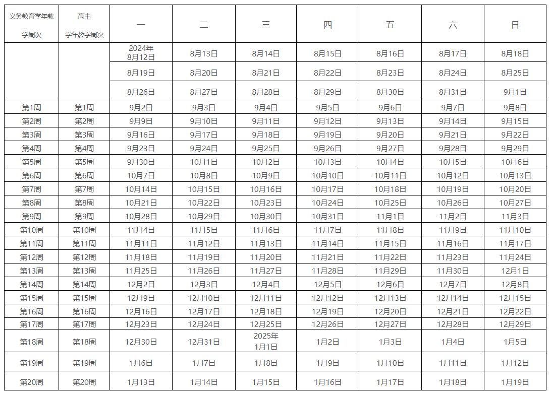 说明:1.义务教育九年级8月26日开学新学年上课;义务教育一到八年级9月2日开始新学年上课。2.高中三年级8月12日开始新学年上课;高中一年级、二年级9月2日开始新学年上课。3.2025年1月20日开始全市所有中小学校开始放寒假。4.节假日放假时间以政府公布的放假安排为准。5.2025年1月29日为农历春节,2月12日为元宵节。