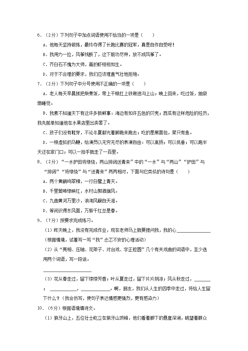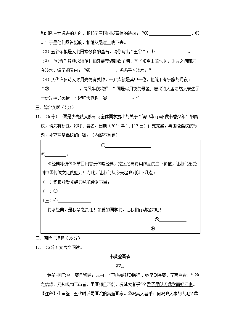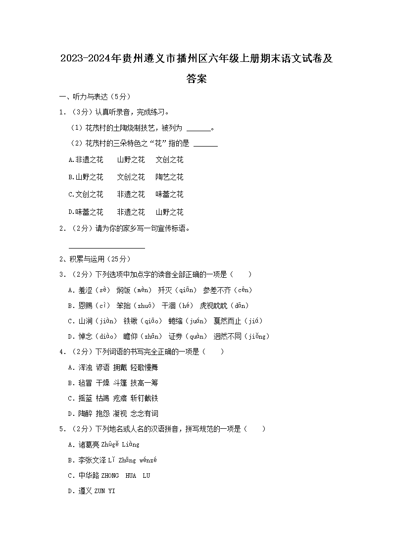【文档名称】 2023-2024年贵州遵义市播州区六年级上册期末语文试卷及答案(Word版).doc