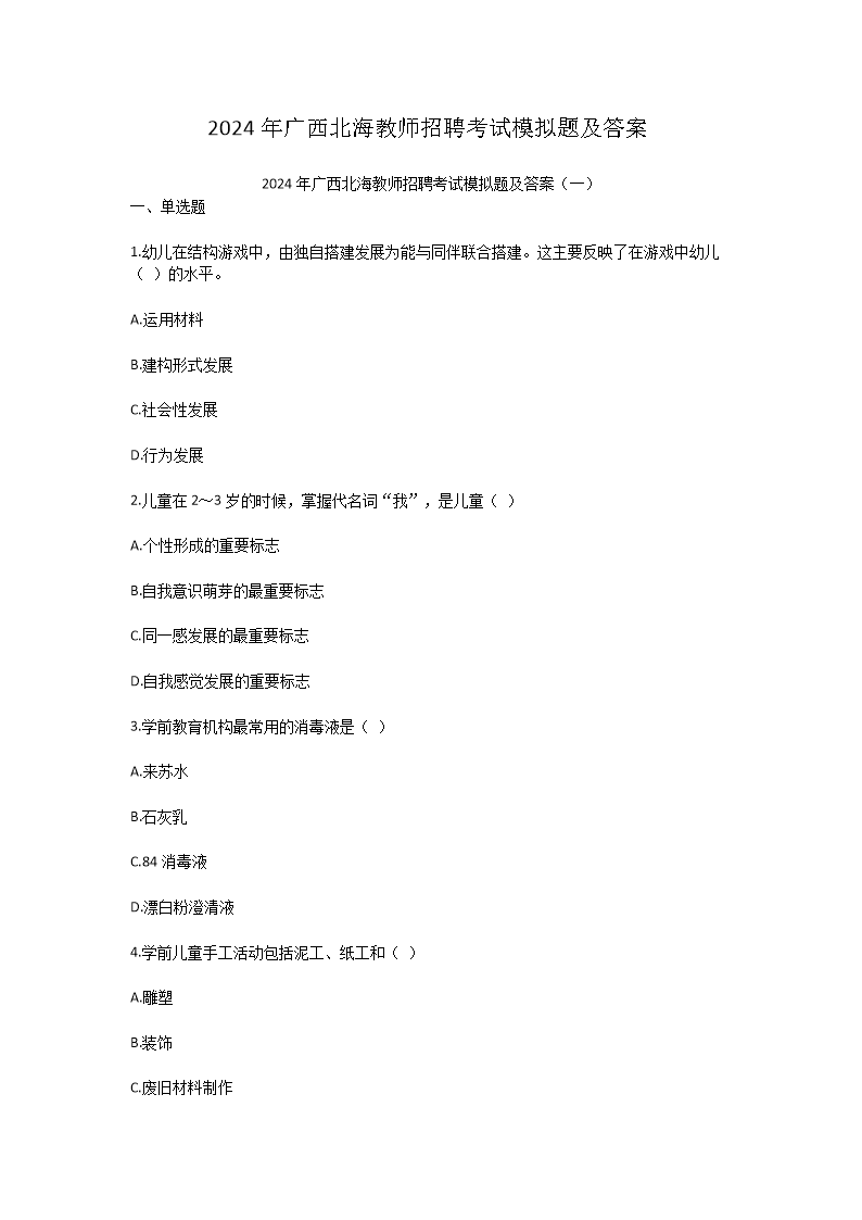 【文档名称】 2024年广西北海教师招聘考试模拟题及答案(Word版).doc