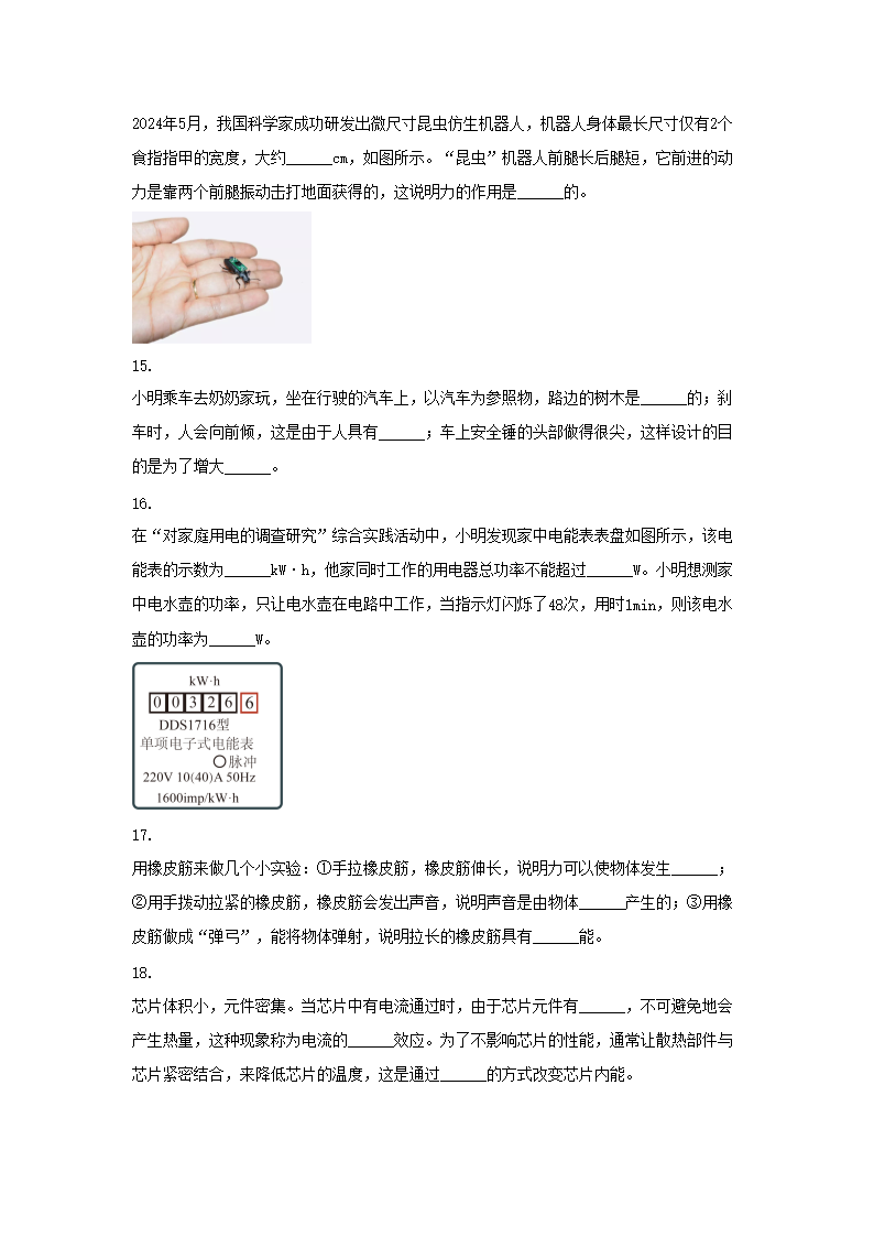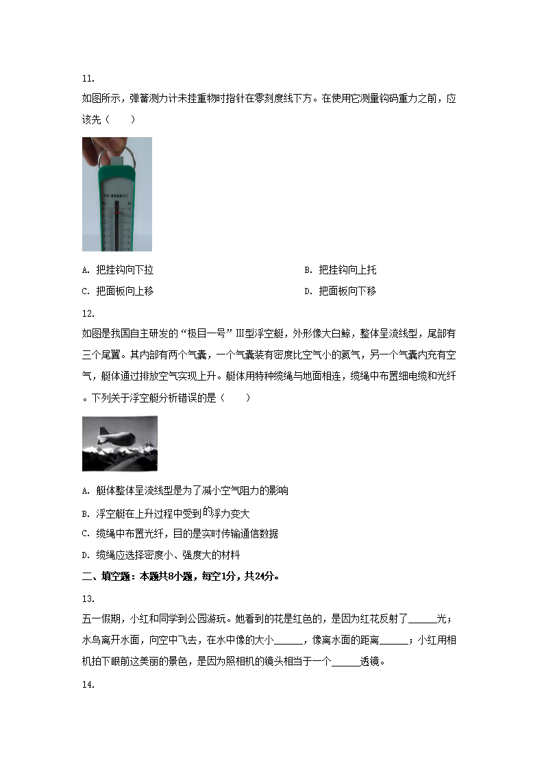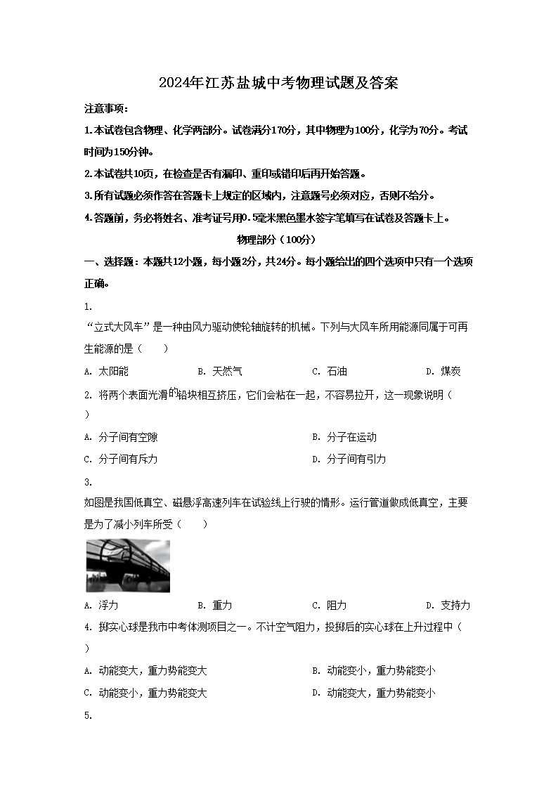【文档名称】 2024年江苏盐城中考物理试题及答案(Word版).doc