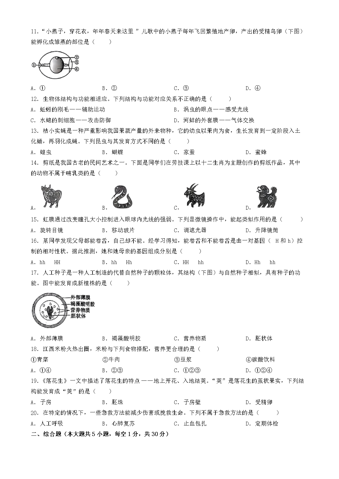【文档名称】 2024年江西抚州中考生物试题及答案(Word版).doc
