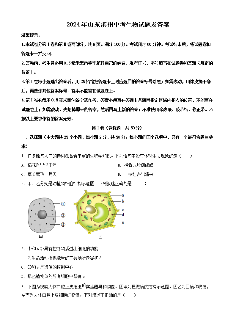 【文档名称】 2024年山东滨州中考生物试题及答案(Word版).doc