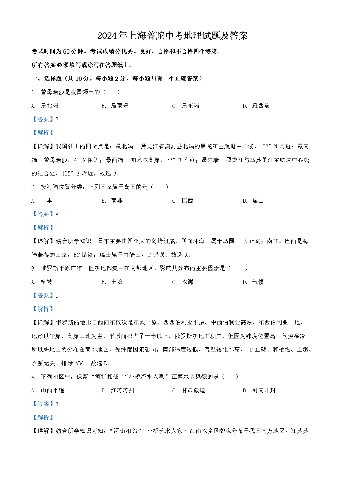 【文档名称】 2024年上海普陀中考地理试题及答案(Word版).doc