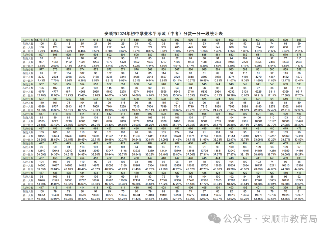 2025年贵州安顺中考分数段统计表(已公布)