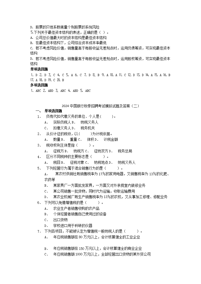 【文档名称】 2024中国银行秋季招聘考试模拟试题及答案(Word版).doc