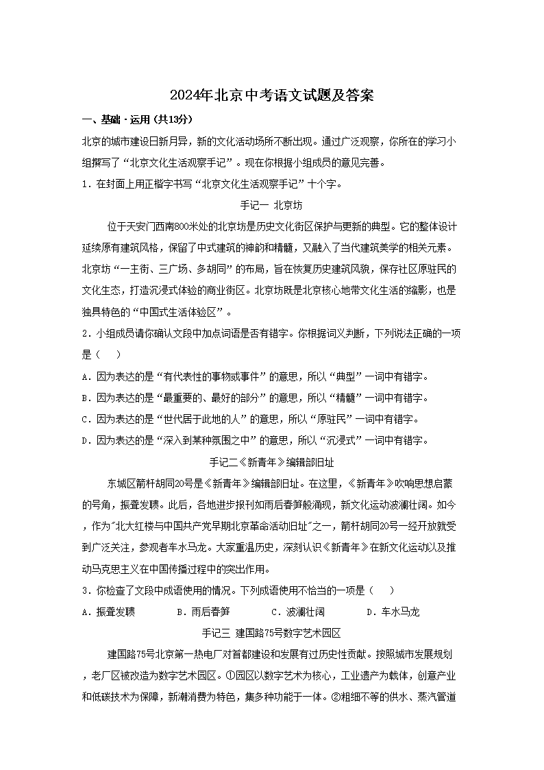 【文档名称】 2024年北京中考语文试题及答案(Word版).doc