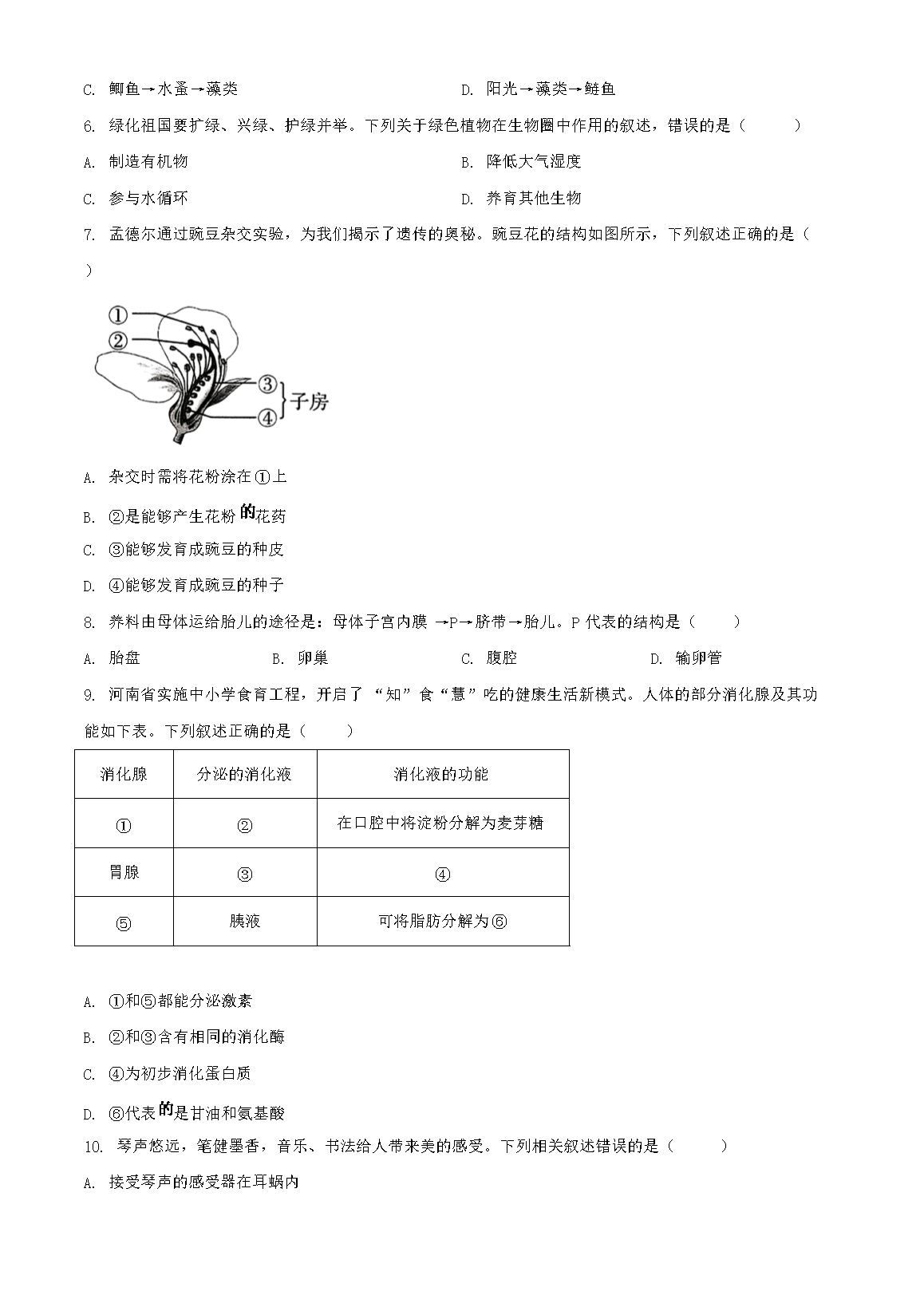 【文档名称】 2024年河南驻马店中考生物试题及答案(Word版).doc