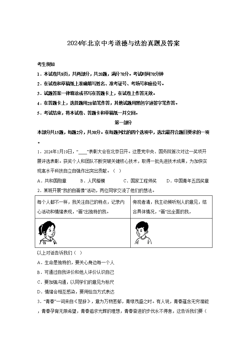 【文档预览】 无忧考网整理发布2024年北京中考道德与法治真题及答案(Word版),前五页预览如下: