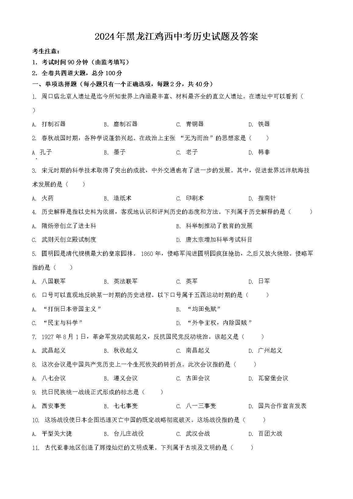 【文档名称】 2024年黑龙江鸡西中考历史试题及答案(Word版).doc