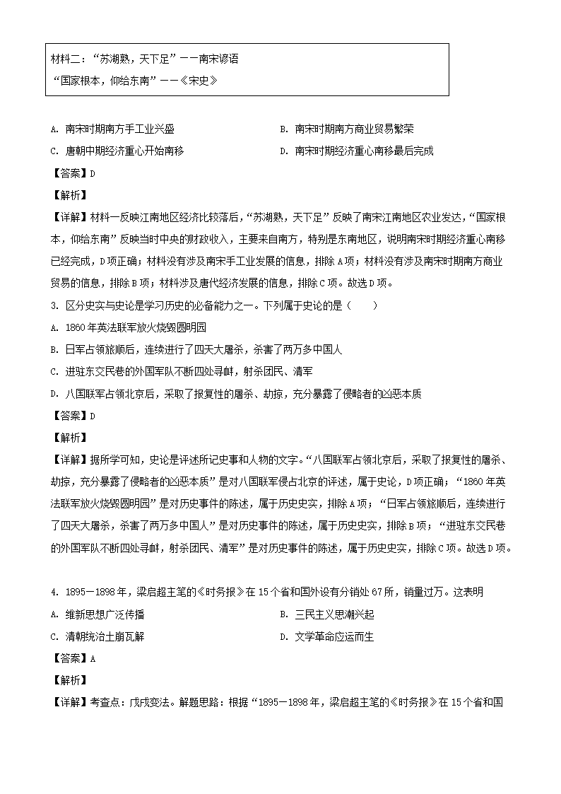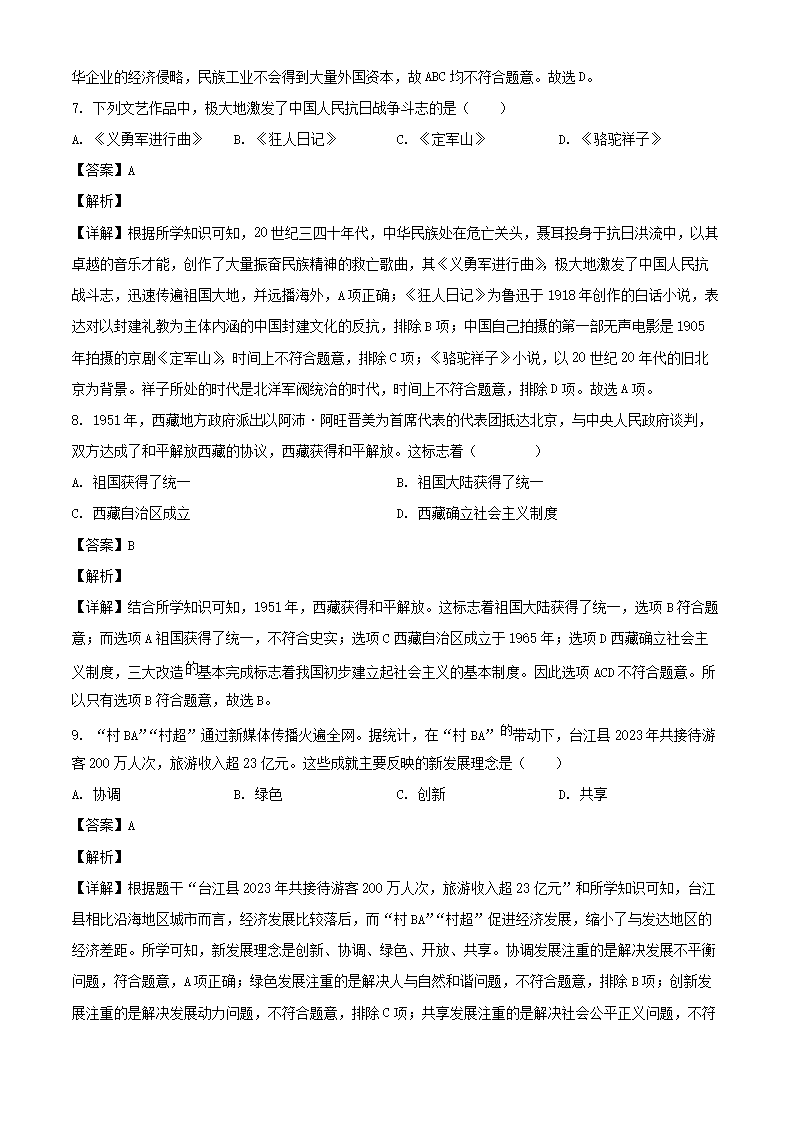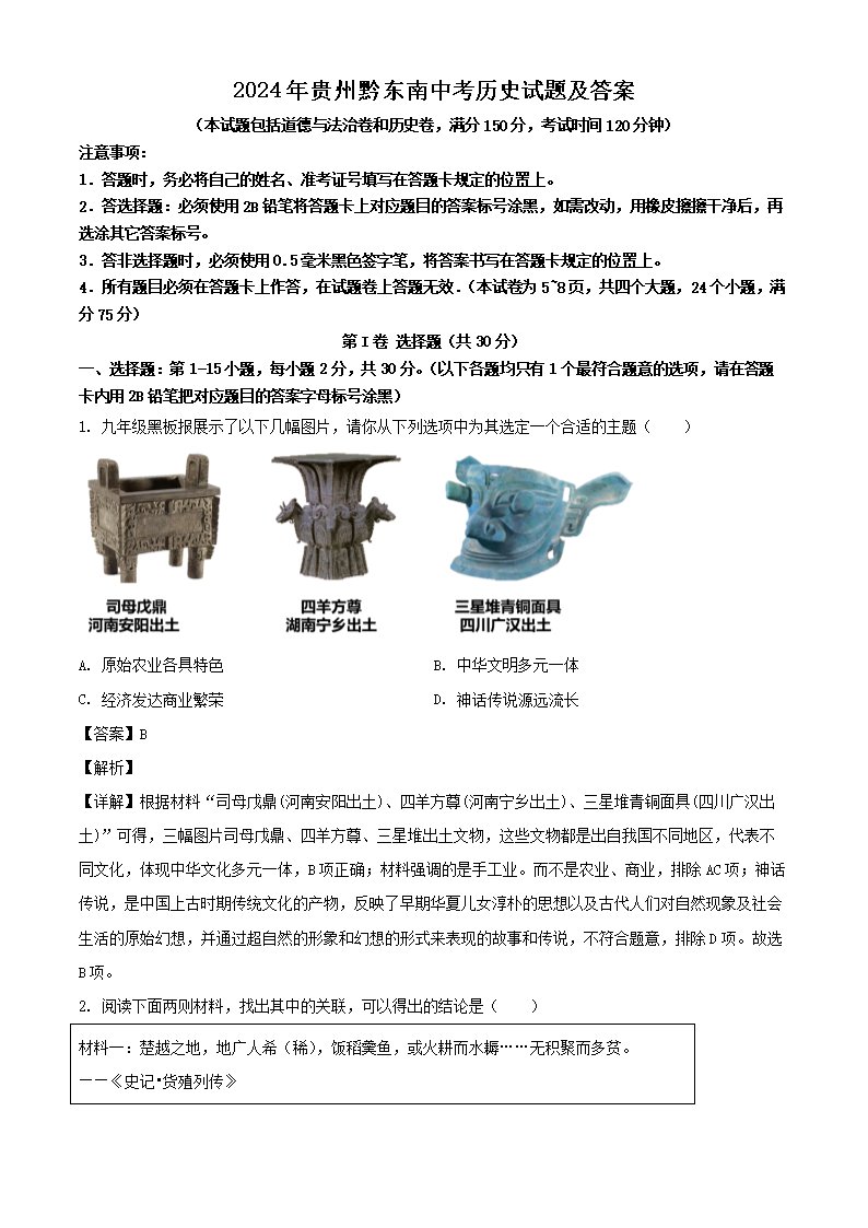 【文档名称】 2024年贵州黔东南中考历史试题及答案(Word版).doc