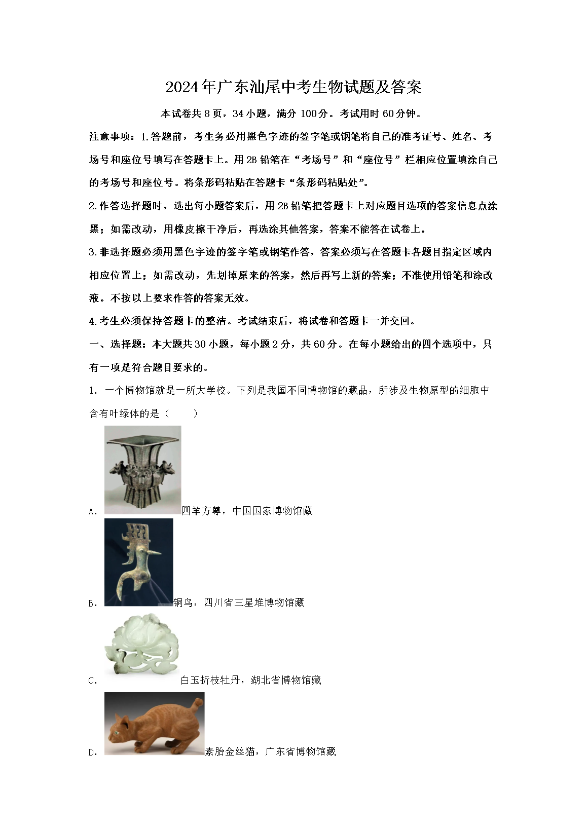 【文档名称】 2024年广东汕尾中考生物试题及答案(Word版).doc
