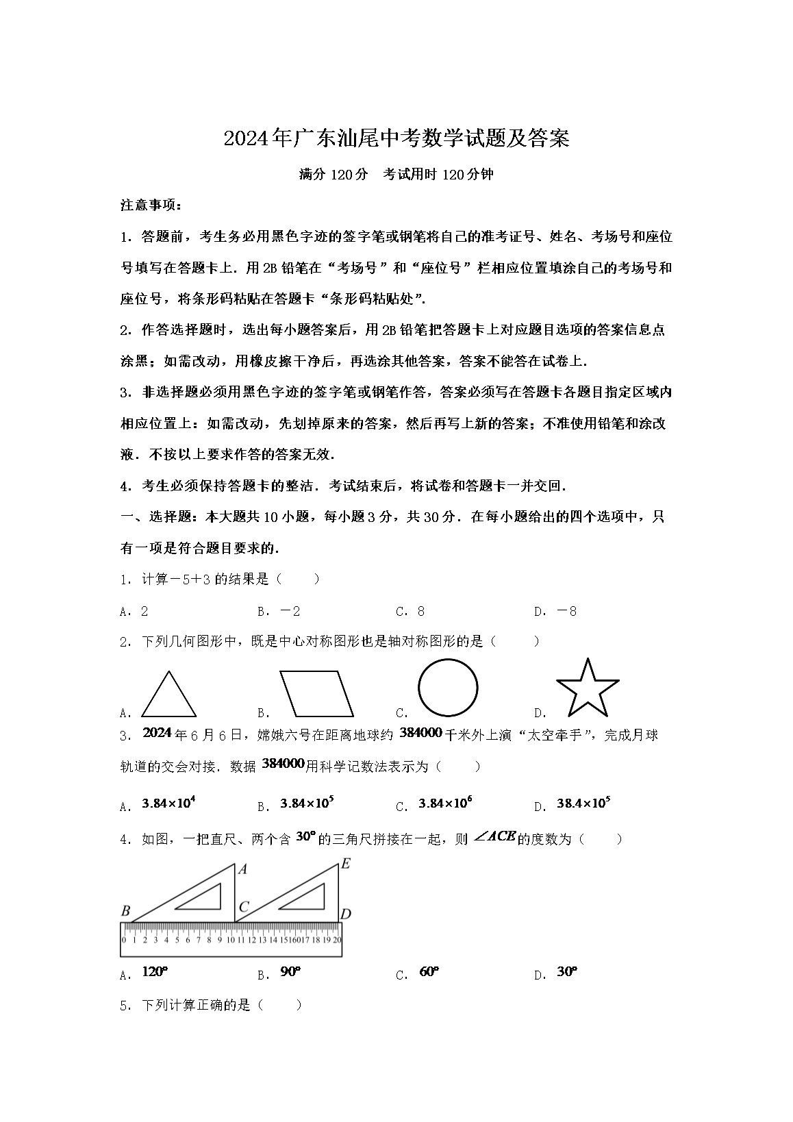 【文档名称】 2024年广东汕尾中考数学试题及答案(Word版).doc