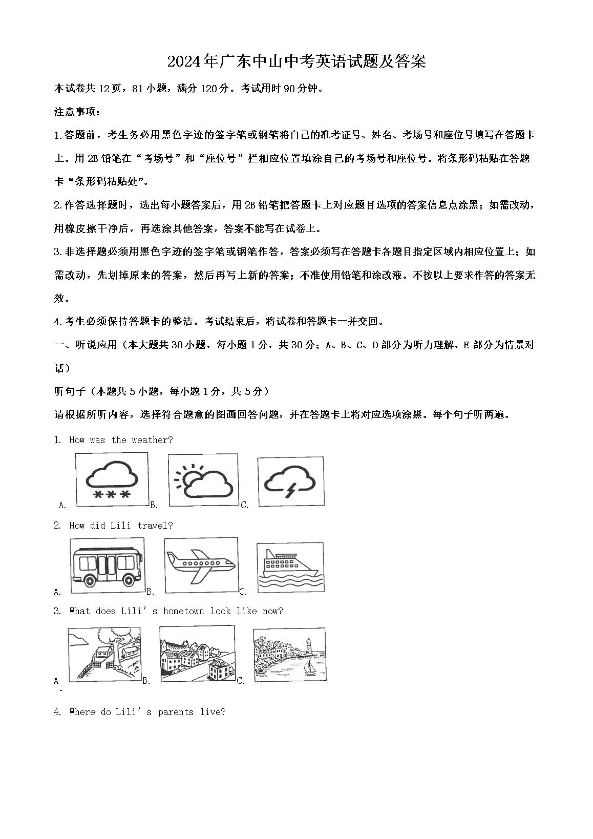 【文档名称】 2024年广东中山中考英语试题及答案(Word版).doc