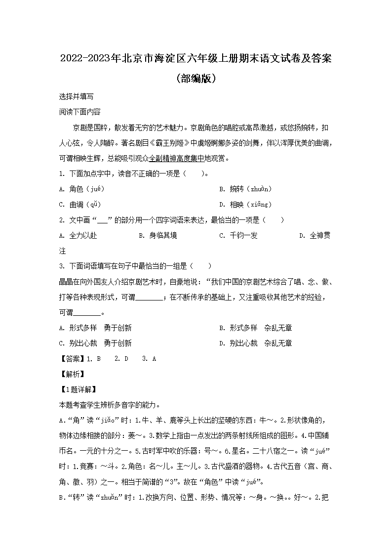 【文档名称】 2022-2023年北京市海淀区六年级上册期末语文试卷及答案(部编版)(Word版).doc