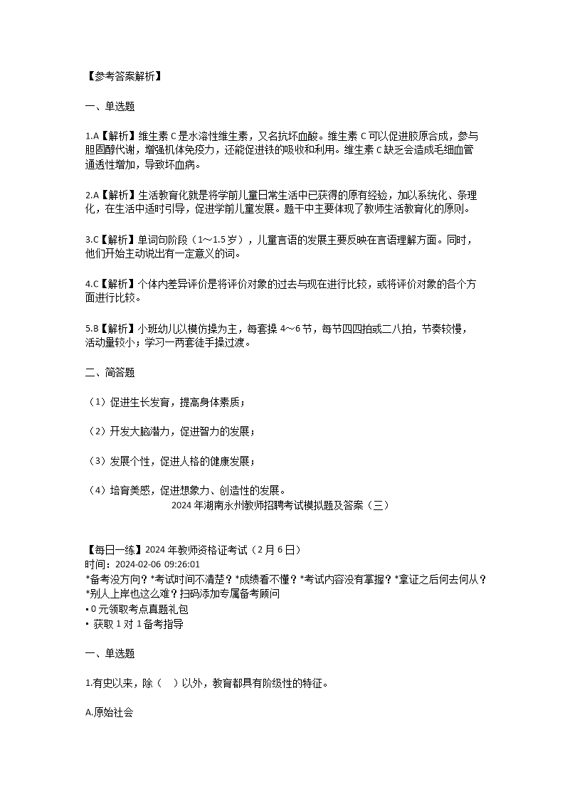 【文档预览】 无忧考网整理发布2024年湖南永州教师招聘考试模拟题及答案(Word版),前五页预览如下: