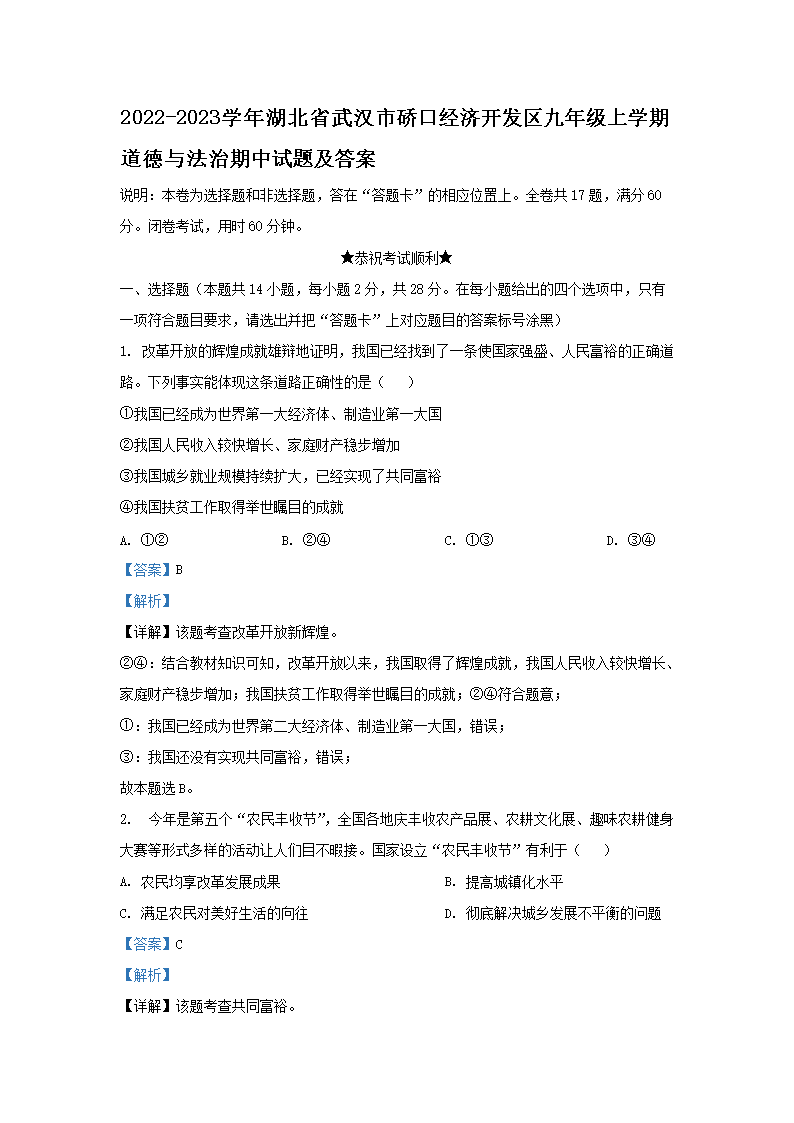 【文档名称】 2022-2023学年湖北省武汉市硚口经济开发区九年级上学期道德与法治期中试题及答案(Word版).doc