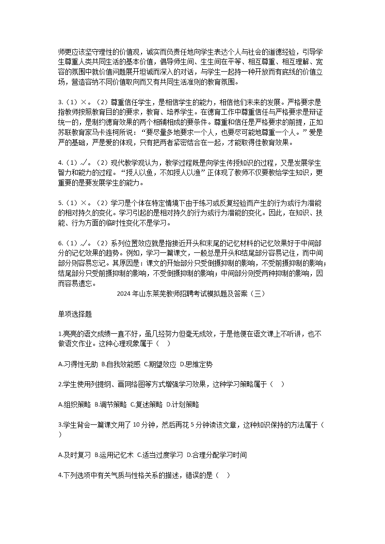 【文档名称】 2024年山东莱芜教师招聘考试模拟题及答案(Word版).doc