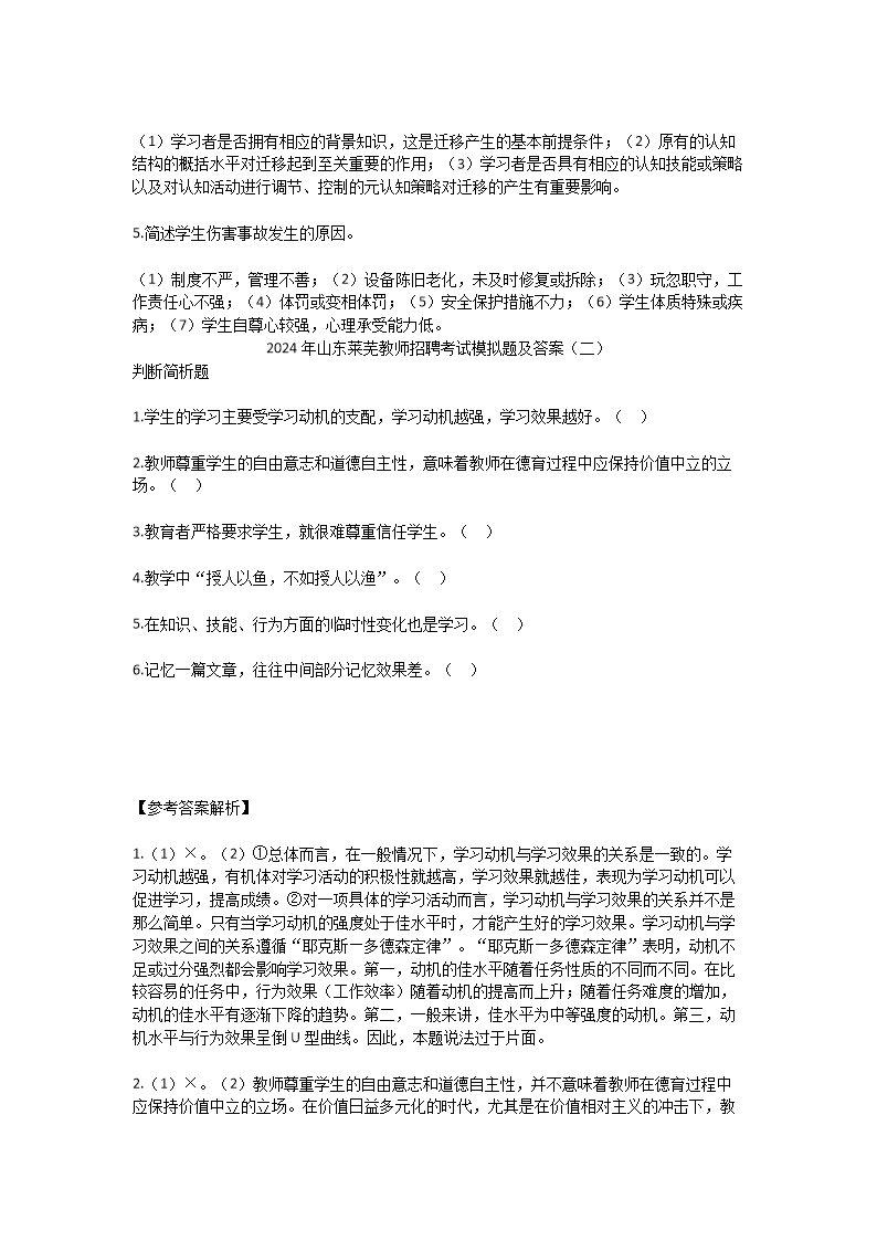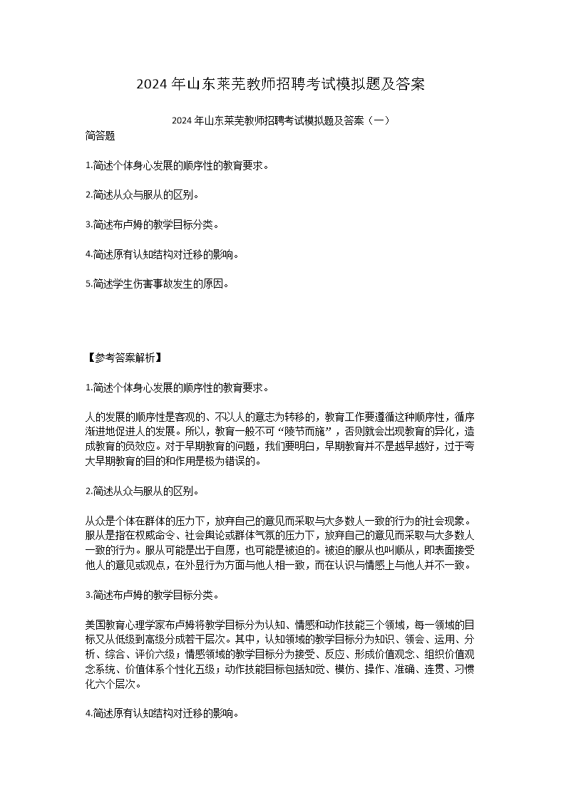 【文档预览】 无忧考网整理发布2024年山东莱芜教师招聘考试模拟题及答案(Word版),前五页预览如下: