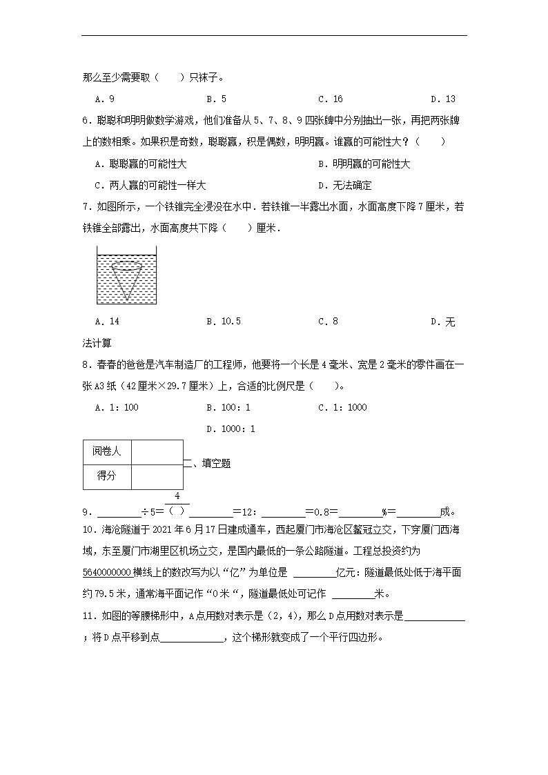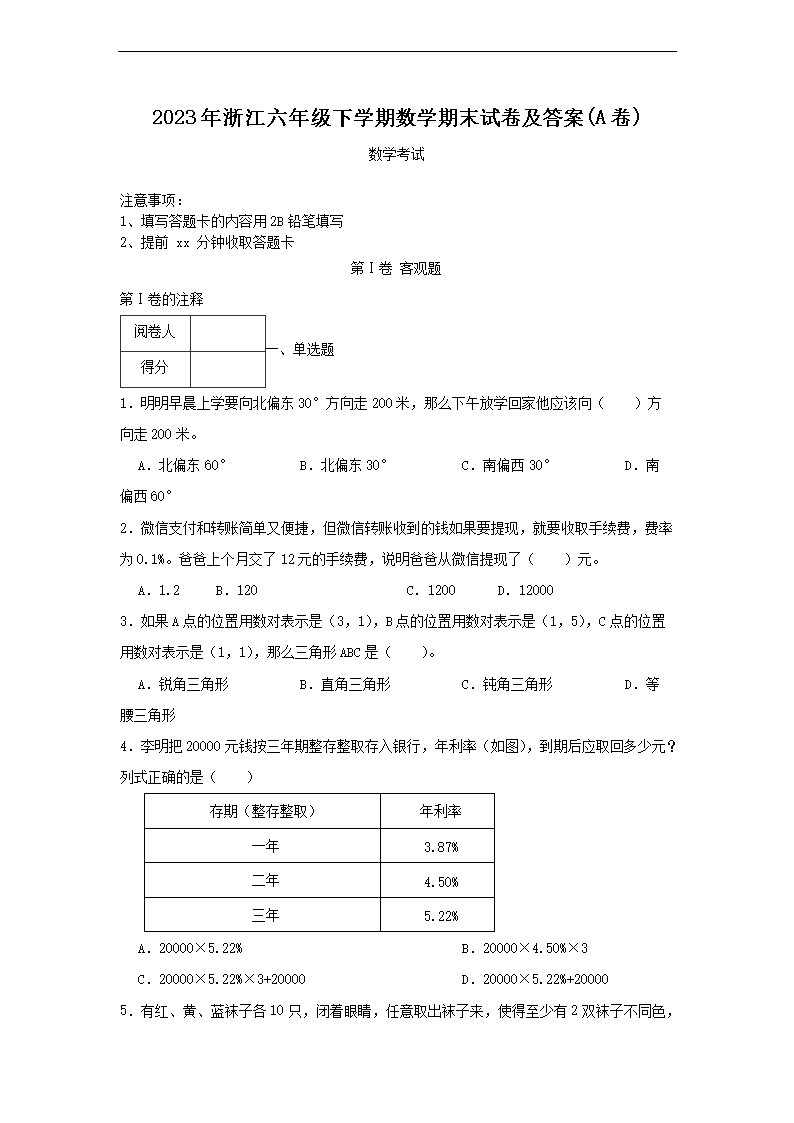 【文档名称】 2023年浙江六年级下学期数学期末试卷及答案(A卷)(Word版).doc