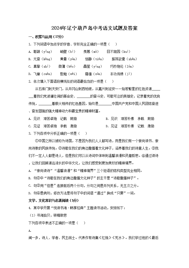 【文档名称】 2024年辽宁葫芦岛中考语文试题及答案(Word版).doc
